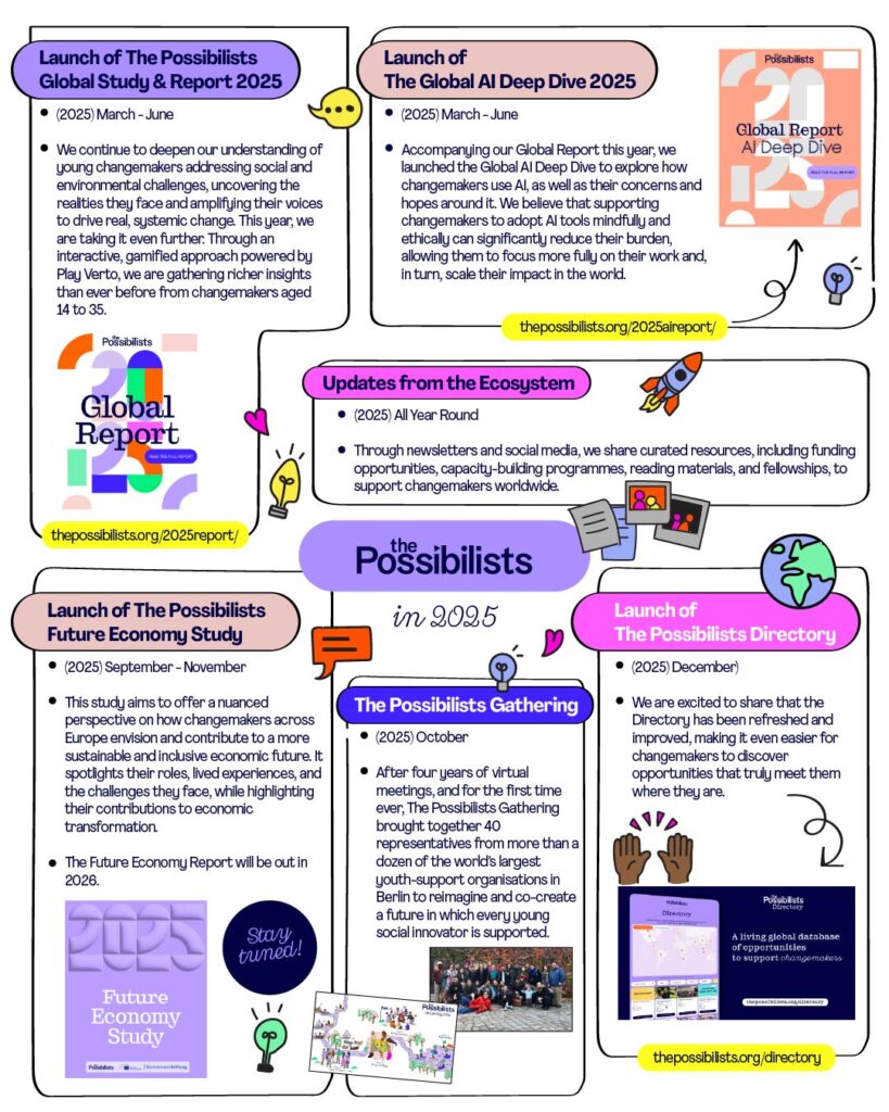 In 2025, The Possibilists continued to deepen its role as a global alliance working to improve conditions for young changemakers by translating their experiences into insights that can ultimately lead to systemic change.