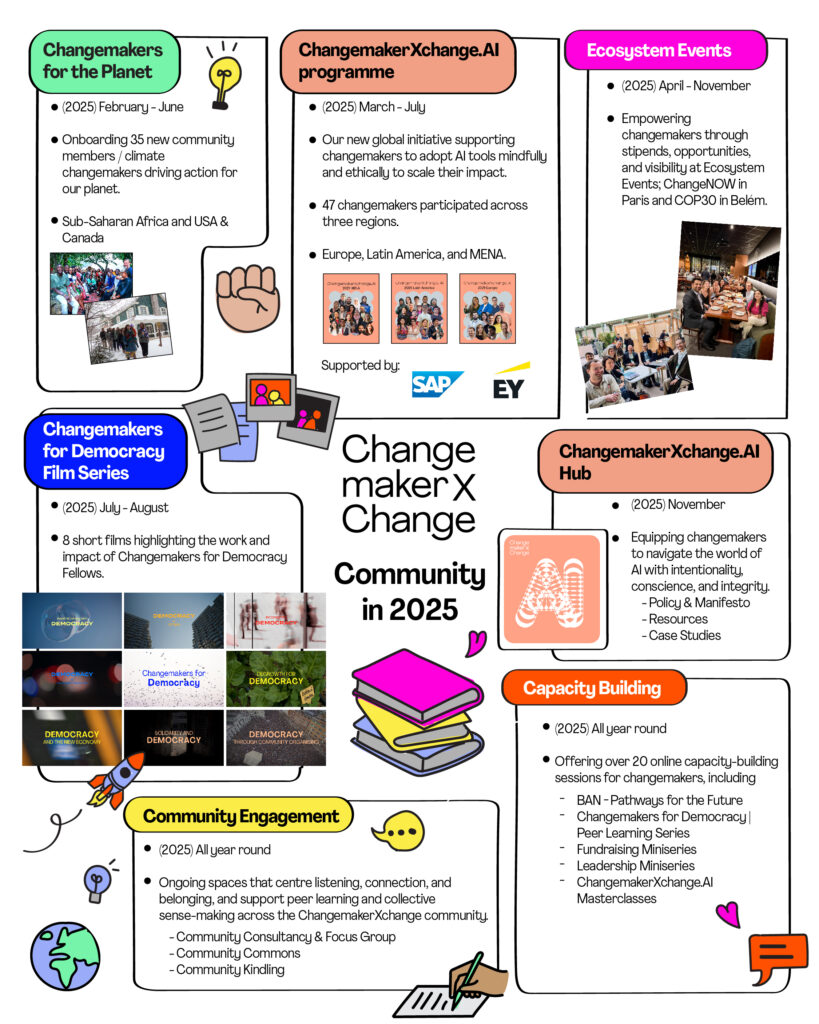 Towards the end-of-year, our work around AI came into fuller expression with the launch of the ChangemakerXchange.AI Hub. Designed as a living resource, the Hub brings together our Policy and Manifesto, practical resources, and real-world case studies, equipping changemakers to navigate the AI landscape with intentionality, conscience, and integrity.